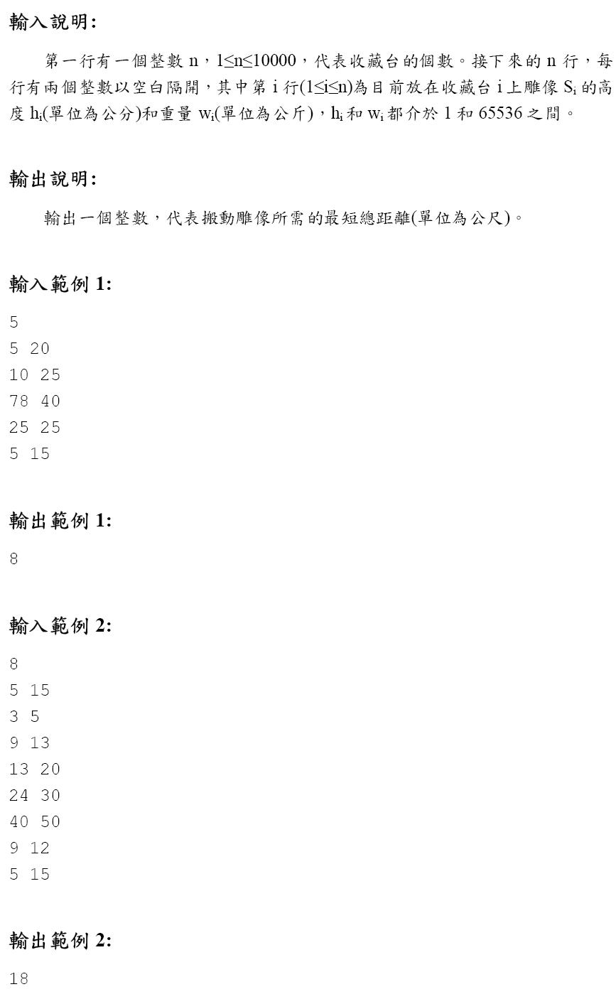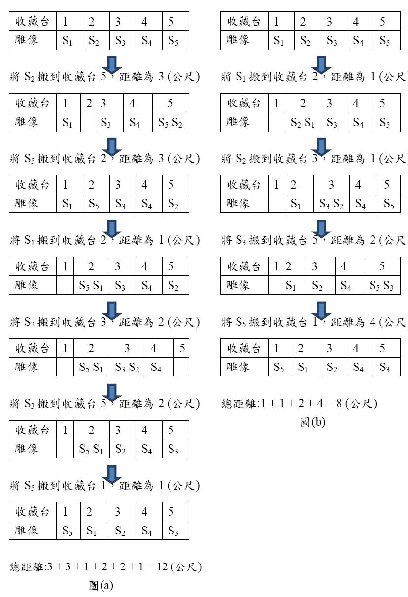 重新擺放在收藏台上且搬動的總距離為最短。本題假設任二相鄰收藏台的距離為