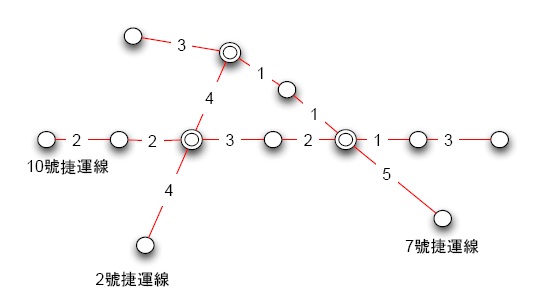 時間為: 1分鐘 (在捷運上等待離站) + 2分鐘 (到達2號站所需時間) + 1分鐘 (在捷運上等待離站) + 2分鐘 (到達 3號站所需時間) = 6分鐘。若以輸入範例第四個測資:12 7 2 1 10 1 為例,使用者於 12:07抵達 2號捷運線的 1號站,目的地為 10號線的 1號站,因此搭乘捷運所需的最短時間為:1分鐘 (12:10之捷運進站後搭上捷運並在捷運上等待離站) + 4分鐘 (到達 2號站所需時間) + 1分鐘 (2號線於 12:15到站後下車等待 12:18抵達的 10號線,上車並在捷運上等待離站) + 2分鐘 (到達10號線2號站所需時間) + 1分鐘 (在捷運上等待離站) + 2分鐘 (到達 10號線 1號站所需時間) = 11分鐘。