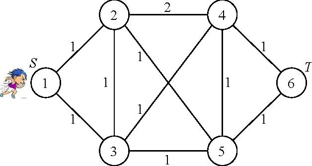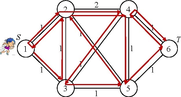 →2→1→2→4→3→5→2→4→5→6→4→6=T,可在 15單位時間從起點出發,將所有街道都跑過至少一次,且到達終點。然而此種跑法所需的時間並非最短。事實上,此例中花費時間為最短的跑法如圖三所示,為 1→2→3→1→3→4→2→5