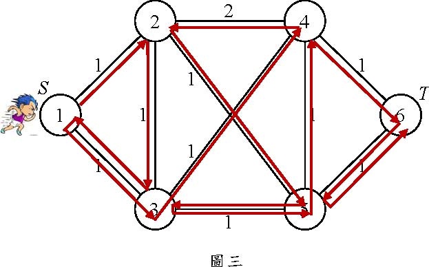 在圖一的例子中,Nodd =0,S=1,T=6。圖二說明其中一種跑法為:S=1→3