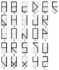 有些 LED 系統用線段來表示字元,就像某些計算機或加油機一樣。假設我們就有一個這樣的 LED 系統,其中每個標準的英文字母都是由 10 個可能的線段來組成,這些線段的編號如右圖: