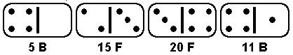 要注意的是骨牌在放置時,有正向及反向兩個方向。遊戲從左側開始,移除任何一對骨牌之後要回到最左邊。在本例中,由於 12 號骨牌 (正向) 及 17 號骨牌 (反向) 相接的點數都是 5 點,所以先行移除。