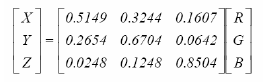 X = 0.5149 * R + 0.3244 * G + 0.1607 * B