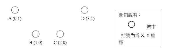 這個國家有許多城市,這些城市的市長會議決議要大家集資建設一個衛星通訊中心,期望能夠用最新的通訊科技與世界接軌。為了節省成本,衛星通訊中心必須建築在城市中。除了建設通訊中心的經費外,建設通訊中心與各個城市間的通信線路也需要耗費相當多的金錢。因為通訊線路只能以東西向及南北向的方式架設,通訊中心到一個城市的通信線路長度,是彼此間東西向距離長度,加上南北向的距離長度。通往不同城市通信線路不能夠共用,也就是說雖然通過同樣一個地方,目的地不同仍然要各自計算成本。而通信線路的計價,與長度成正比,也就是說一條兩公里長的通信線路是一條一公里長線路的兩倍價錢。所以選擇建築通訊中心的城市地點就格外重要,如果能夠挑到一個好地點,那麼就能夠花最少的金錢去建設到每個城市的獨立通信線路。例如有四個城市 A、B、C、D,座標位置分布如下圖: