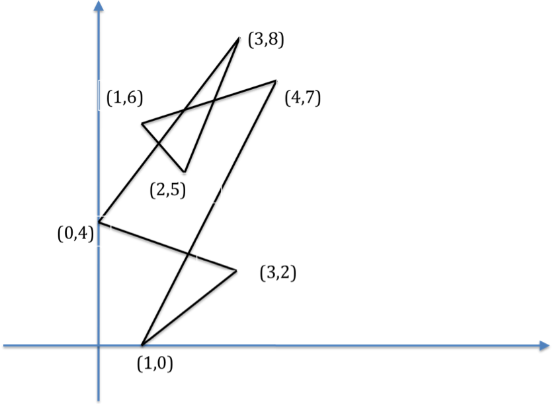 例如,在下方的图例中,使用者共依次输入(1,0)、(3,2)、 (0,4)、(3,8)、(2,5)、(1,6)、( 4,7)七个点座标,且这些点座标相对应的线段彼此有相交的现象。若我们将所有线段所围起来的区域涂上一样的颜色后,我们可以得到一个新的11边形,其端点座标分别为(3,8)、(2.5,6.5)、(4,7) 、(2.1111,2.5926)、(3,2)、(1,0)、(2.1111,2.5926)、(0,4)、(1.2857,5.7143)、(1,6)、(1.6667,6.2222)。
