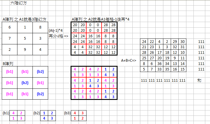 我們要完成以下 A陣列、B陣列,然後將 A+B就是 6x6的魔方陣