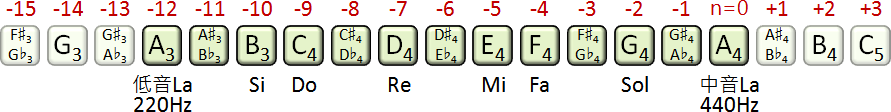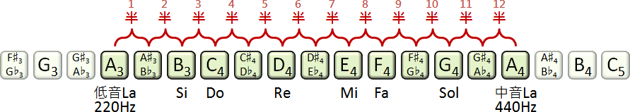 低音La與中音La之間,等分為12個半音。中音La與高音La之間也是如法炮製,不贅述。順帶一提,音樂家規定兩個半音等於一個全音。