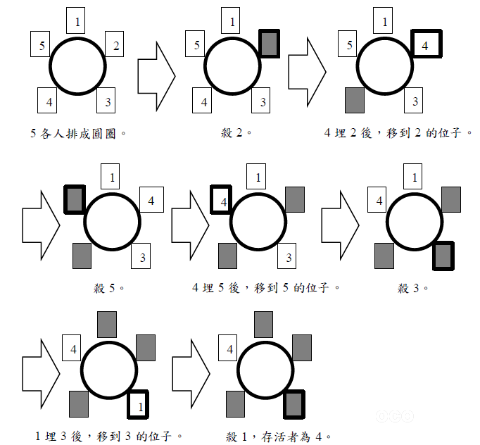 例如,當n=5、k=2、i=1,那麼被殺的順序為2、5、3、1,存活者為4,