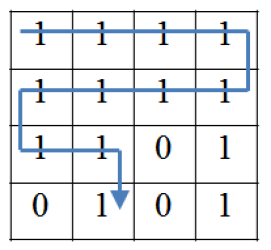貪吃龍遊戲是一個很有趣的益智遊戲,其目標從棋盤左上角出發找 到越多的連續「 1」越好。以下是一個輸入的例子: