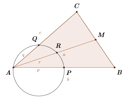 西元2016年09月26日(晚上),今天是本學期「板橋高中 進階程式設計課程」的開課日,今天的主題是檢討總計 4 場的「板橋高中 105資訊能力競賽名賽」之中的所有題目,其中因為"OωO學長"的實力實在是太強了,所以負責講當中的 2 場考試,總共合計 8 題,這對於懶惰無極限的"OωO學長"來說是個極其困難完成的任務,不過"OωO學長"還是順利地講解完畢。由於"OωO學長"中午在"snail老師"的貼文下留言,所以在場就有人問"OωO學長"如果明天真的放颱風假"OωO學長"會出什麼題目?"OωO學長"學長表示說雖說自己是有準備備用題啦,但是那是個幾何數學題,"OωO學長"怕出了之後參加「板橋高中 AP 課程」的各位學弟妹們完全不會解,還因此大受打擊從此對程式設計失去信心。那個題目大致如下:如下圖,有一 ∆ABC ,其中 AB線段長 = b , AC線段長 = c , M 為 BC線段 之中點, 且 AM線段長 = a , P、Q 分別是在 AB線段 及 AC線段 上之兩點,且 AP線段長 = p , AQ線段長 = q ,現以 A、P、Q 三點作一圓,其圓交 AM射線 於 R,求 AR線段長 = ?