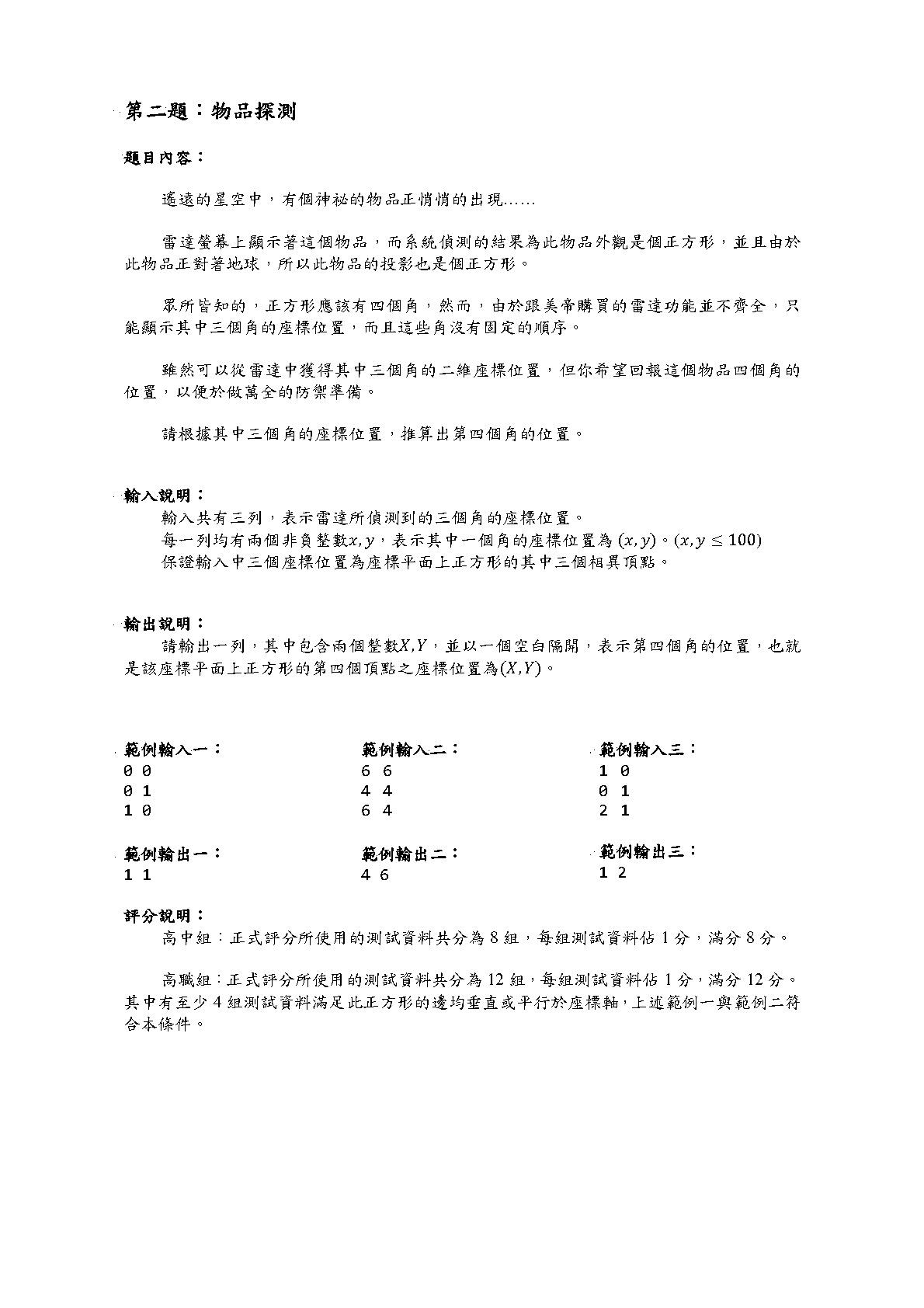 高職組:正式評分所使用的測試資料共分為12組,每組測試資料佔1分,滿分12分。其中有至少4組測試資料滿足此正方形的邊均垂直或平行於座標軸,上述範例一與範例二符合本條件。