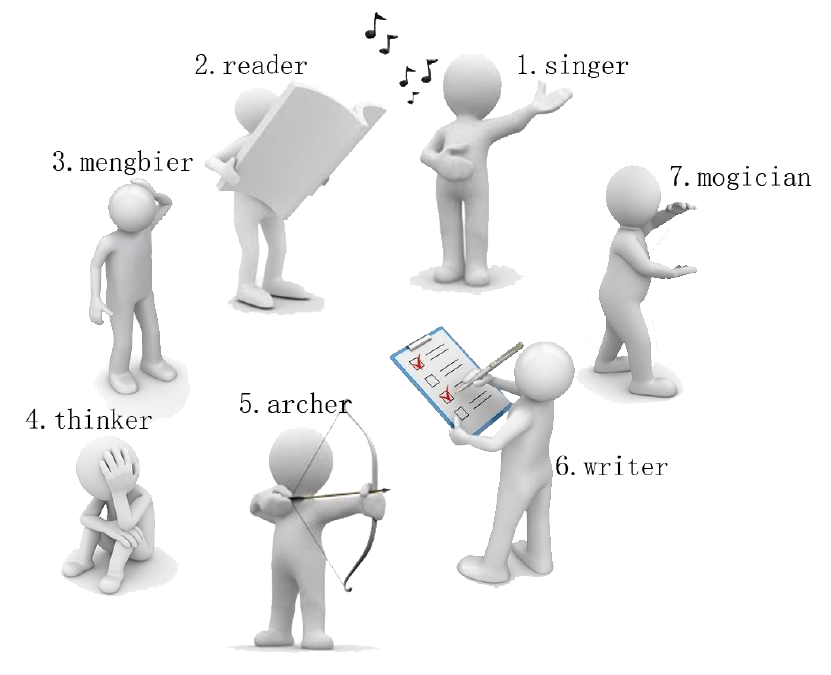小南有一套可爱的玩具小人,它们各有不同的职业。