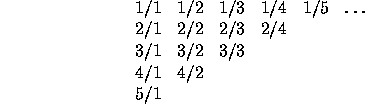 現代數學中有一個有名的證明(由Georg Cantor所提出的):有理數是可數的。他使用一個圖表(Cantor's 列舉)列舉出有理數,如下圖所示: