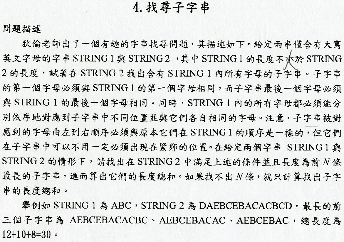 輸入第三列為一個整數N(N不大於100),代表要找出前N條長度最長並滿足題目條件的子字串。