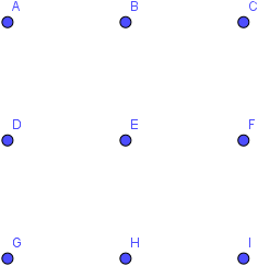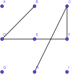 首先,我們將九個點依序標上A到I的英文字母(左圖),中間的圖片便是一種符合以上規則的密碼,而其中一種連法是依序連過B、D、E、F、C、H點,我們將這種連法寫為「BDEFCH」,其密碼長度為6(因為經過6個點)另一種連法則是「HCFEDB」。再看看右邊的圖片,「ABCEGHIF」是一種符合規則的連法,但「ABCEFIHGE」不是,因為E點被連到了兩次,所以不是一種符合規則的連法,而在連接線段AC時,因為A、C間的B點尚未被連接,故會自動被連接上去。此外,「BACEGHIF」也是一種符合規則的連法,在這種連法中的AC線段,因為B點先前已被連接過,故此處會自動略過。