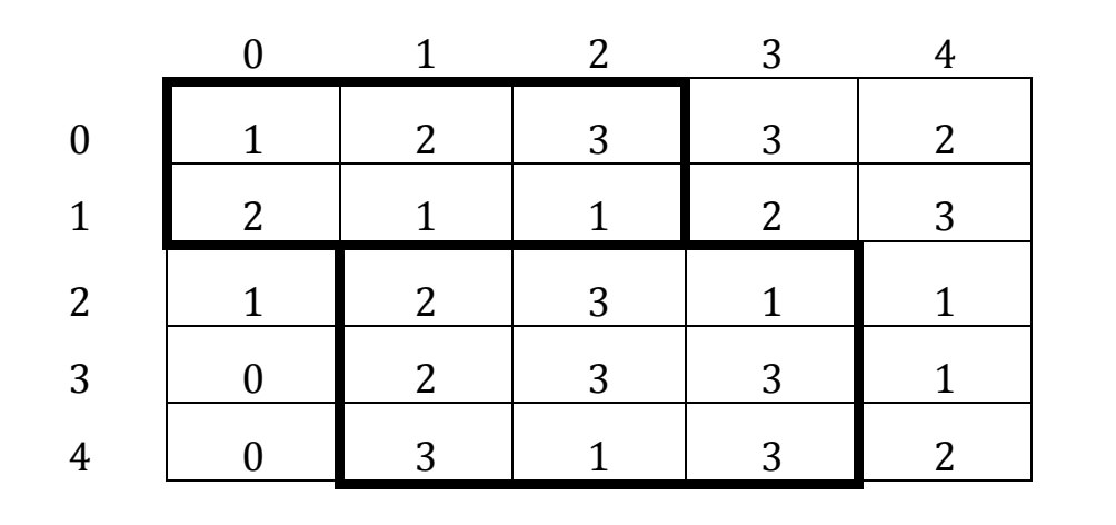 下圖為一個 N=5 的方陣 A,子矩陣 A[0:1][0:2]共有六個元素,出現最多的元素是 1,出現了 3 次,並未超過總數的一半,因此沒有絕對多數。