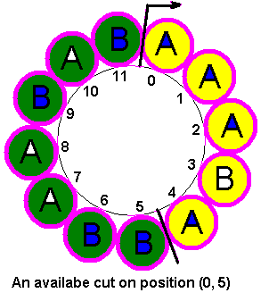 這裡有一個圓,它是由 A 和 B 所組成,我們給它一個名字叫做AB Circle,你可以看到圖中從圓中找出兩個端點切開,我們可以得到兩個字串,仔細觀察,聰明的你應該發現了,其中一個字串中 A 的數量等於另一個字串中 B 的數量。