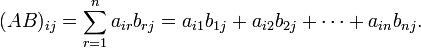矩陣相乘最重要的方法當然是一般矩陣乘積了,它只有在第一個矩陣的列數 (column)和第二個矩陣的行數(row)相同時才有定義。一般單指矩陣乘積時,指的便是 一般矩陣乘積。若 A 為 m×n 矩陣,B 為 n×p 矩陣,則他們的乘積 AB(有時記做A · B)會是 一個 m×p 矩陣。其乘積矩陣的元素如下面式子得出: