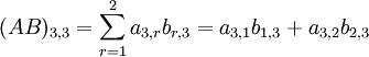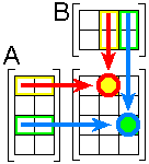 左邊的圖表示出要如何計算 AB 的 (1,2) 和 (3,3) 元素,當 A 是個 4×2 矩陣和 B 是個 2×3 矩陣時。分別來自兩個矩陣的元素都依箭頭方向而兩兩配對,把每一對中的兩個元素相乘,再把這些乘積加總起來,最後得到的值即為箭頭相交位置的值。