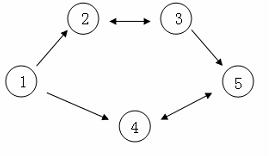 假设 C 国有 5 个大城市,城市的编号和道路连接情况如下图,单向箭头表示这条道路为单向通行,双向箭头表示这条道路为双向通行。