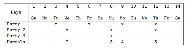 參數之一是一個正整數h,h稱為罷會(hartal)參數,它表示同一個政黨連續兩次連續罷會的間隔天數。