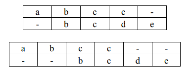 上例中,我們稱符號 - 為 gap。第一列有 gap 表示要對第二個字串進行刪除,第 二列有 gap 表示要對第二個字串進行新增;若兩列的字母不同,表示要將第二列 的字串取代為第一列的。以上三種情況都會增加編輯距離,若對應到相同字元則 不會。第一種作法的編輯距離為 7 (2+3+2),而第二種作法的編輯距離為 11 (2+2+3+2+2)。第一種作法為所有作法中,編輯距離最小的作法,因此將字串 bcde 變成字串 abcc 的最佳編輯距離為 7。