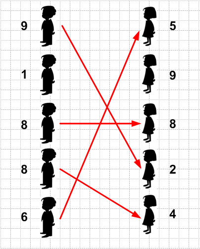 有 N 位適婚男性與 N 位適婚女性,參加了月老婚姻介紹所舉辦的我愛紅娘配對活動;