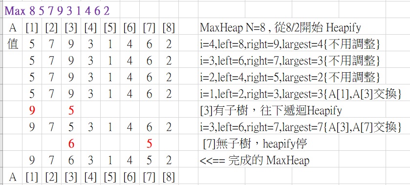 在 f498中建構二元堆積的方式是一次加入一個節點,在本題中,我們將要一次給N個節點,放在陣列A[1]...A[N]中,i從N/2的節點開始往上至1(ROOT),做如上的Heapify(A,i)動作完成本題的二元堆積建構。