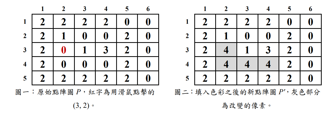 小明用某繪圖軟體開啟點陣圖 $\color{black}{P}$,使用軟體中的「填入色彩」功能:用滑鼠點擊 $\color{black}{S_i,S_j}$,所有與 $\color{black}{S_i,S_j}$ 屬於同一個「連通區塊」像素的色彩編號均會轉換成指定的色彩$\color{black}{Z}$。對於影像$\color{black}{P}$ 上任兩個上、下、左或右相鄰的像素$\color{black}{(i, j)}$  與$\color{black}{(i', j')}$ (即 $\color{black}{(i', j') ∈{(i-1, j ), (i+1, j ), (i, j-1), (i, j+1)}} )$,如果$\color{black}{C _{ij}}$ 和 $\color{black}{C_{i'j'}}$ 相同,則說$\color{black}{(i, j)}$ 與$\color{black}{(i', j') }$ 同屬於同一個「連通區塊」。