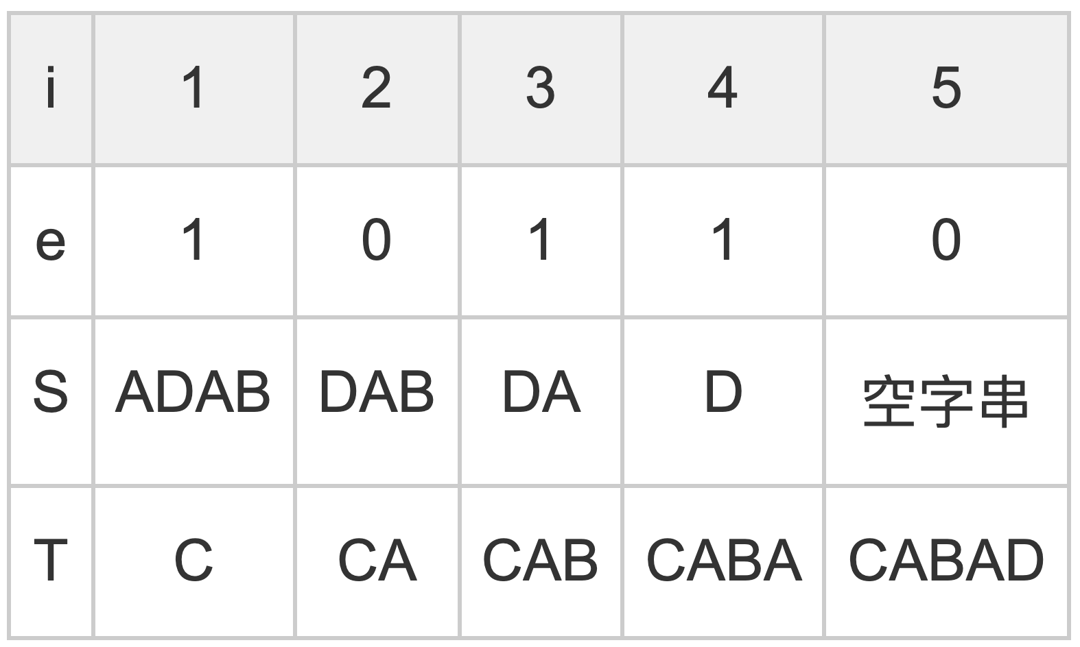 2. 讓 $i$ 從 $1$ 到 $n$ 迭代,如果 $e[i] = 0$ 就將 $S$ 的第一個字元切掉並接到字串 $T$ 的最後一個字元,如果 $e[i] = 1$ 就將 $S$ 的最後一個字元切掉並接到字串 $T$ 的最後一個字元。