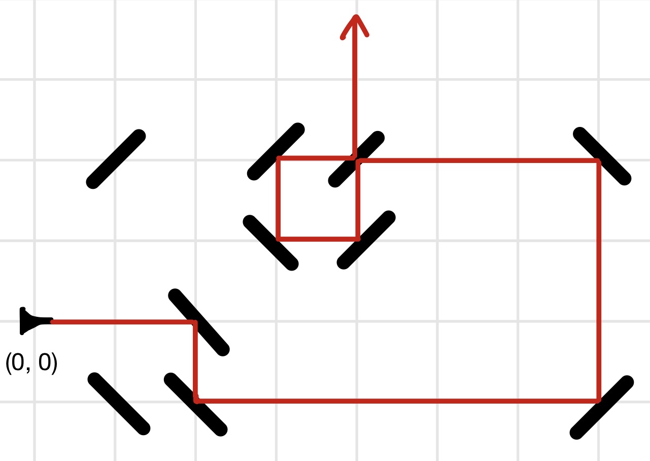 一個雷射光從 (0,0) 向右邊發射,平面上有很多個鏡子,問雷射光會反射幾次,保證輸入沒有無限循環的情形。