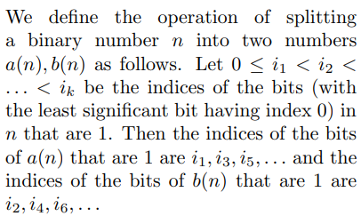 我們定義將二進制數 n 拆分為兩個數 a(n)、b(n) 的操作如下。