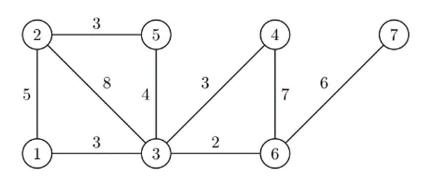 對於一趟被規劃好的旅程,觀光局會為其決定好一個起點 $u$ 和終點 $v$,並找出兩條由 $u$ 到 $v$ 公路相互不重複的路徑,來做為一個完整的旅程規劃。例如下圖是一個 $n = 7$ 、$m = 9$ 的例子,點上標示城鎮的編號,邊上標示公路的長度。