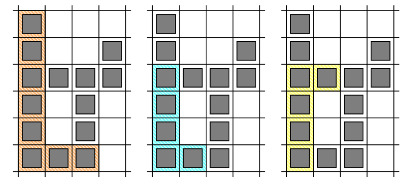 第一個是通過使用單元格形成的:(1,1), (2,1), (3,1), (4,1), (5,1), (6,1), (6,2) , (6,3)