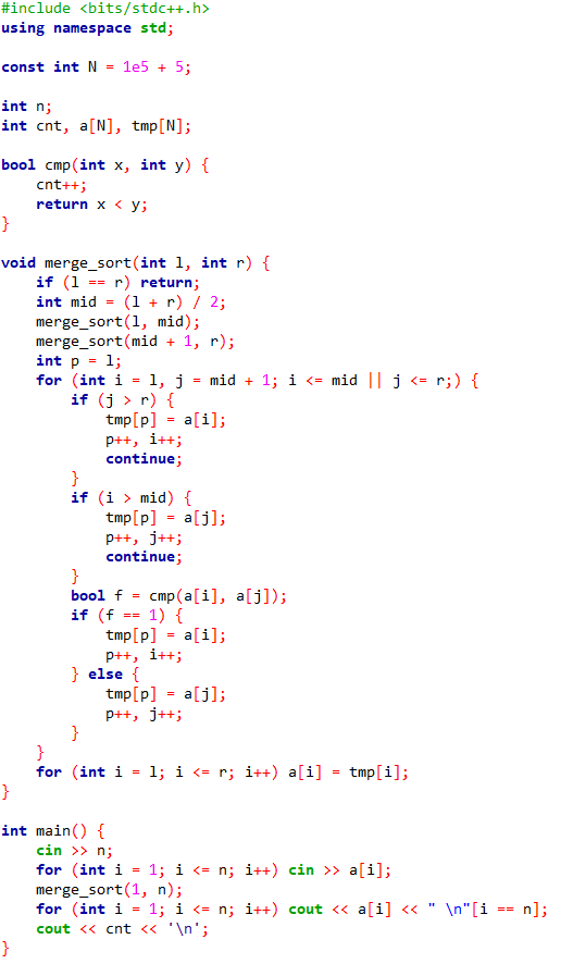 這個是合併排序的程式,輸入陣列大小 $n$ 與一個 $1\sim n$ 的排列 $a_1\sim a_n$,程式會將 $a_1\sim a_n$ 排序好,並輸出呼叫 cmp 函式的次數 cnt。