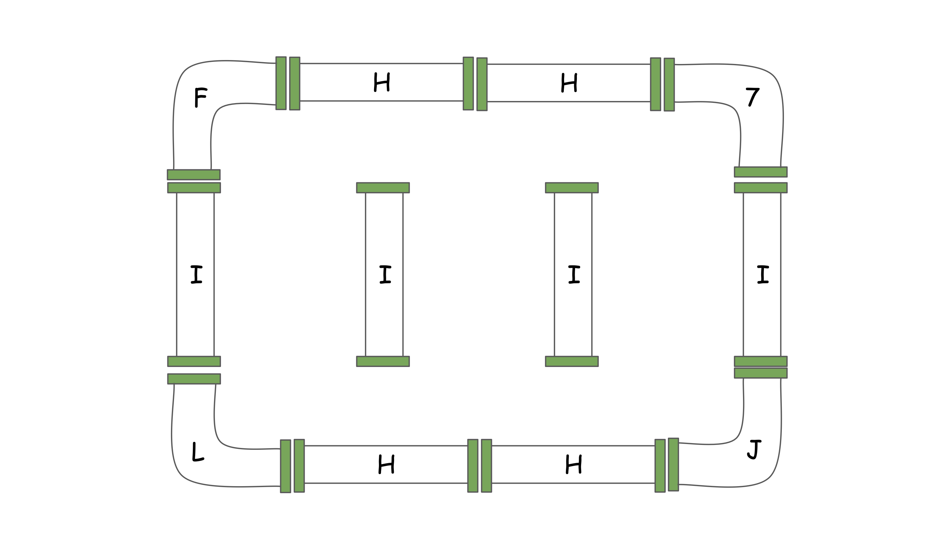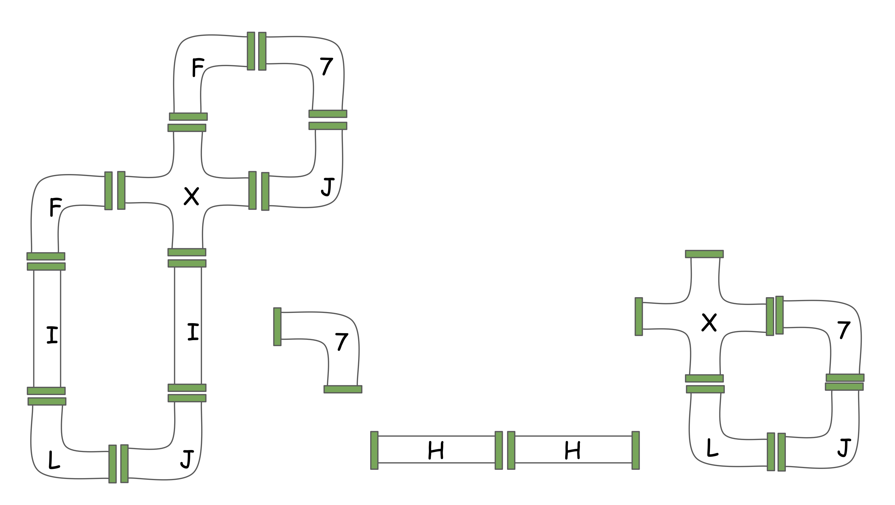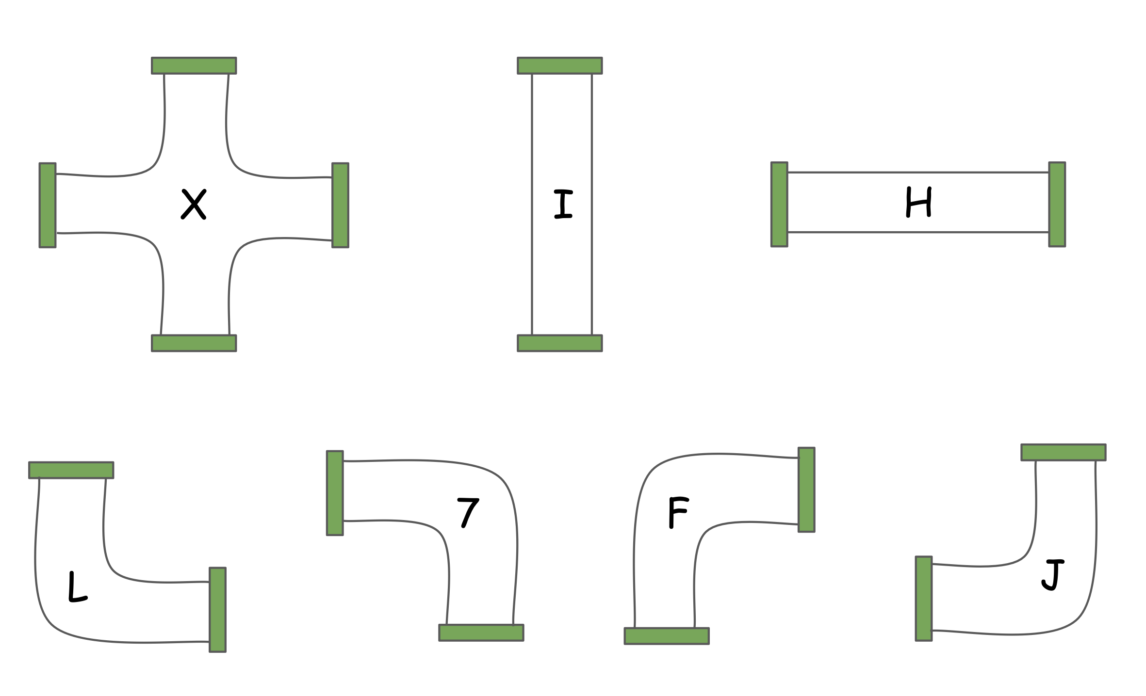其中,X 代表十字架,而 H、I、F、7、L 分別代表其他不同形狀的水管。0 字元代表沒有水管連接的地方。
