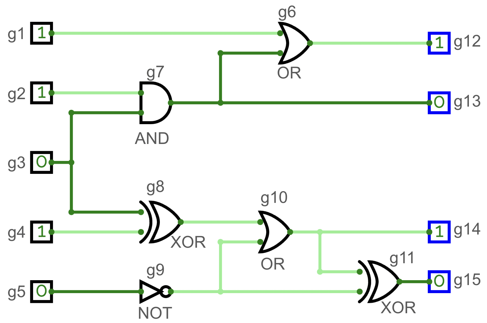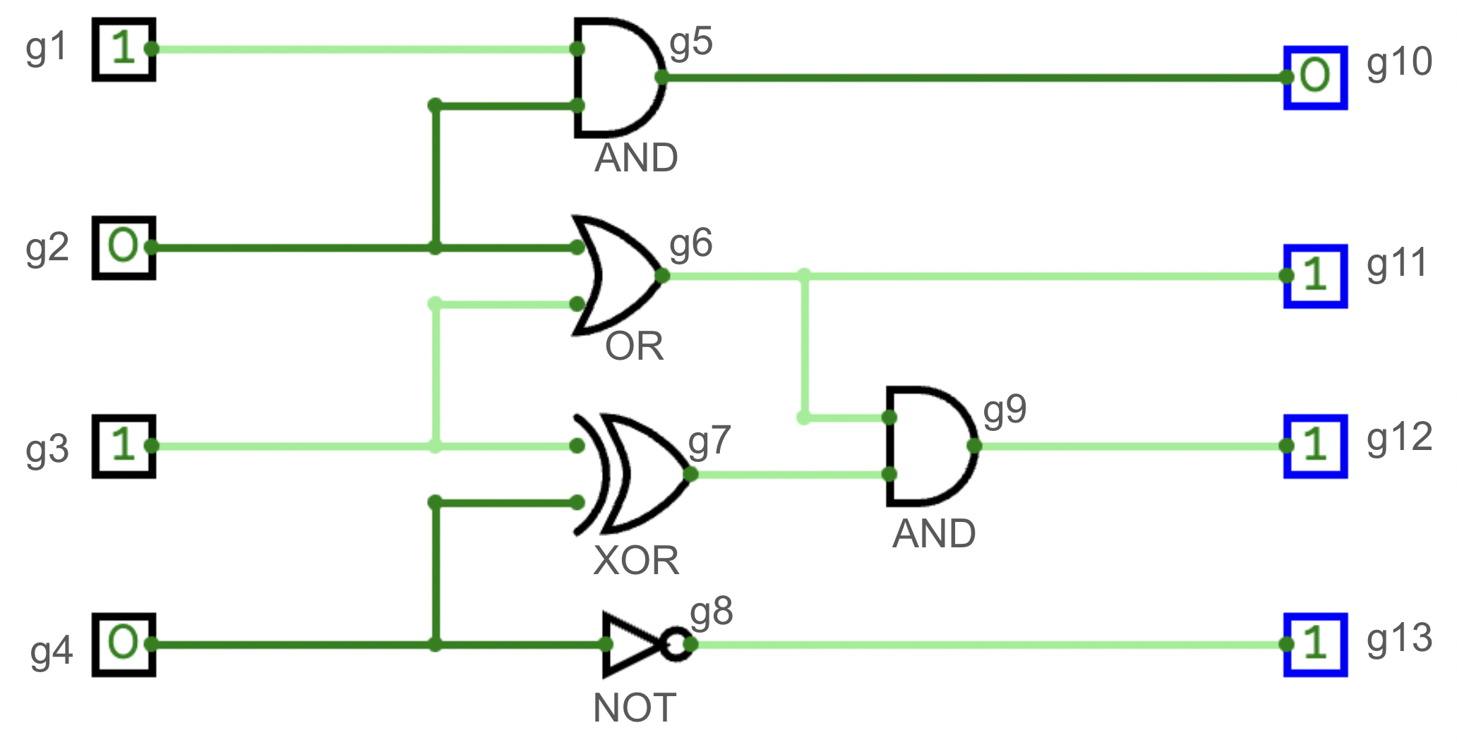每個輸入端口和邏輯閘的輸出會連到至少 $1$ 個至多 $20$ 個其他邏輯閘和輸出端口的輸入,且邏輯閘電路不會接出迴路。