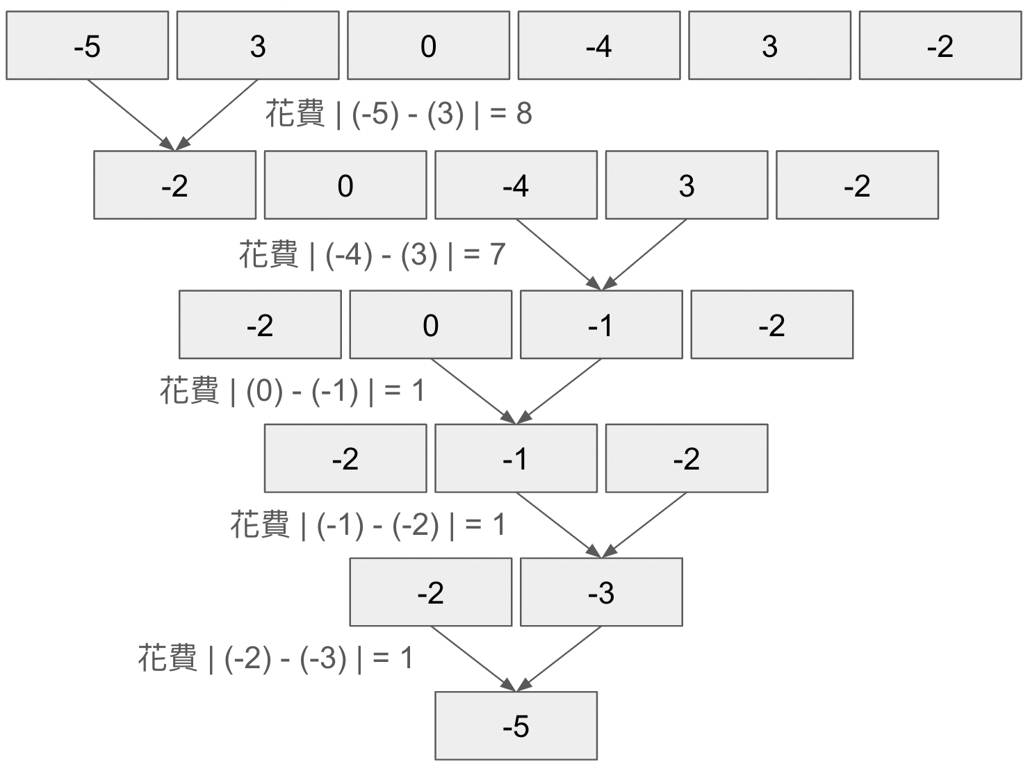 [3, -1, 2, 5][2, 2, 5],花費為 abs(3 - (-1)) = 4[4, 5],花費為 abs(2 - 2) = 0[9],花費為 abs(4 - 5) = 1總花費為 4 + 0 + 1 = 5,因此輸出為 5。