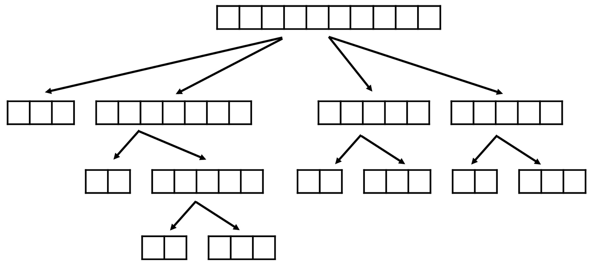 很顯然的,不同切割的 $M$ 及 $N$ 的選擇會有不同的成本。例如:如下圖所示,一根長度 $L=10$ 的木棒有下列兩種選擇:(甲) $L=M+N=3+7$ 或(乙) $L=M+N=5+5$。若選擇(甲) $L=M+N=3+7$ 的切割法,那長度為 $3$ 的木棒沒辦法再切割下去,而長度為 $7$ 的可再切割為 $2+5$,長度為 $5$ 的可再切割為 $2+3$。因此(甲)法的總切割成本為 $10+7+5=22$。