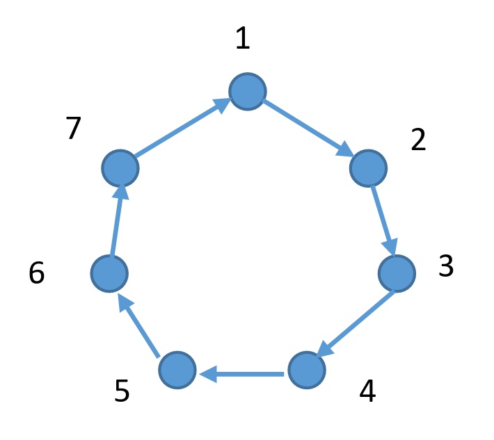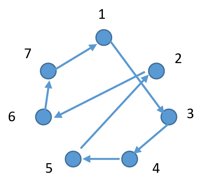 舉例來說,給定 $N=7$ 座城市,城市 $1$ 為路線起點和終點。我們有六條路線,其中第一條路線為最短路線。