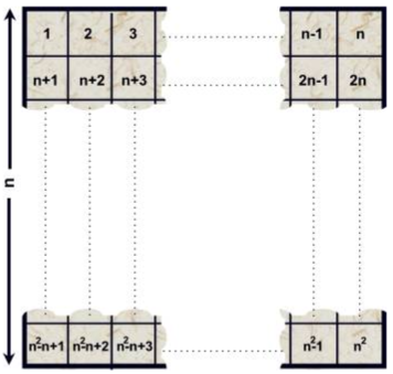 在一個 n×n 的棋盤上,王子和公主玩一個遊戲。棋盤上的方格按如下方式編號為 1, 2, 3, ... , n * n,如下所示: