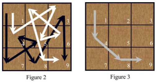 王子沿著以下序列移動:1 → 7 → 5 → 4 → 8 → 3 → 9(黑色箭頭),而公主沿著這個序列移動:1 → 4 → 3 → 5 → 6 → 2 → 8 → 9(白色箭頭)。