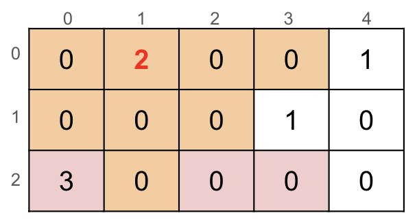 第一行有三個正整數 $M, N, q (2 \le M, N \le 500, 1 < q \le M \times N)$,接下來有 $M$ 行,每一行有 $N$ 個數字。保證炸彈半徑為正數的數量最多只有 $1500$ 個,且在場上的炸彈半徑不超過 $30$。