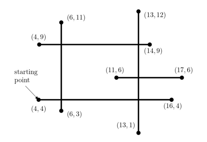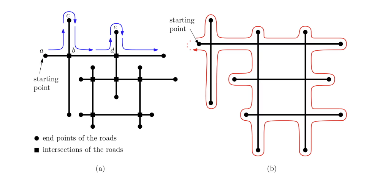 Let us explain with an example in Figure A.1(a). The starting point of the vehicle is the end point a. Then it first reaches the intersection b , turns left and moves toward the end point c . It bounces back at c and reaches b again. Then it turns left and moves along the part between b and d . It reaches another intersection d and turns left toward e , and so on. As in Figure A.1 (b), some parts of the segments are not traversed by the vehicle due to the turning rule of the algorithm, and the vehicle continues to move even when it comes back to the starting end point.
