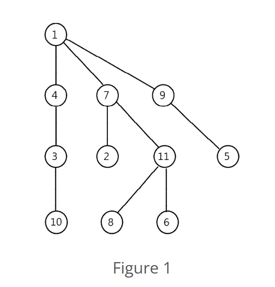 For each vertex v, for a unique path P connecting the root r, among the vertices connected to the vertex v by an edge, the vertex on P is called the 'parent vertex' of v. For example, in Figure 1, the parent vertices of 4, 7, and 9 are 1, and the parent vertices of 2 and 11 are 7.