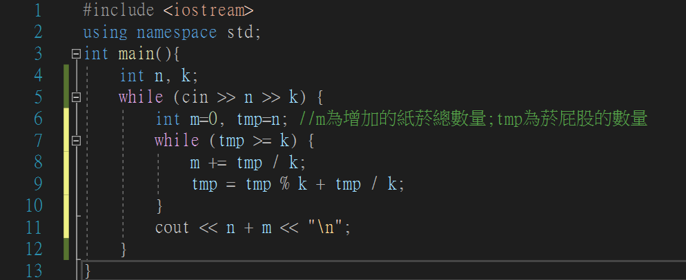 #include using namespace std; int main(){ int n, k; while (cin >> n >> k) { int m=0, tmp=n; //m為增加的紙菸總數量;tmp為菸屁股的數量 while (tmp >= k) { m += tmp / k; tmp = tmp % k + tmp / k; } cout << n + m << "\n"; } }