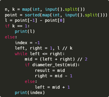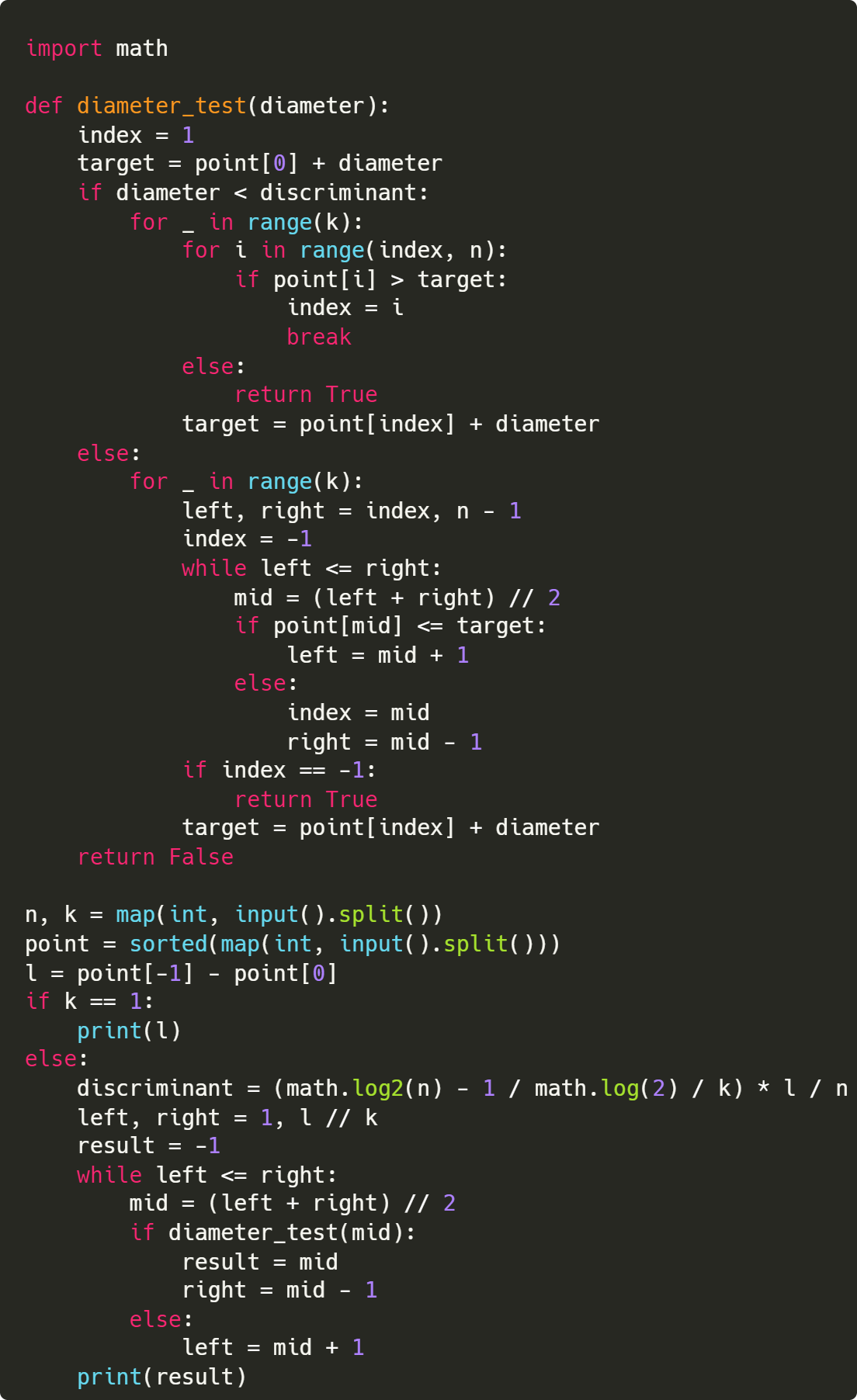 接著只要把陣列改成函式就好了(diameter_test是直徑的測試函式),另外如果k = 1時可以直接輸出最大範圍,到目前為止如果用線性搜的方式完成測試函式,大概可以得到0.6~0.7s的成績。