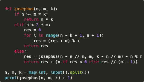 第二個if,是當炸彈傳一圈只能炸一次時,用遞迴無法有效簡化題目的情形,我將條件改成n < 2 * m,原文是n < m,原文的寫法無法精確表示上述情況。