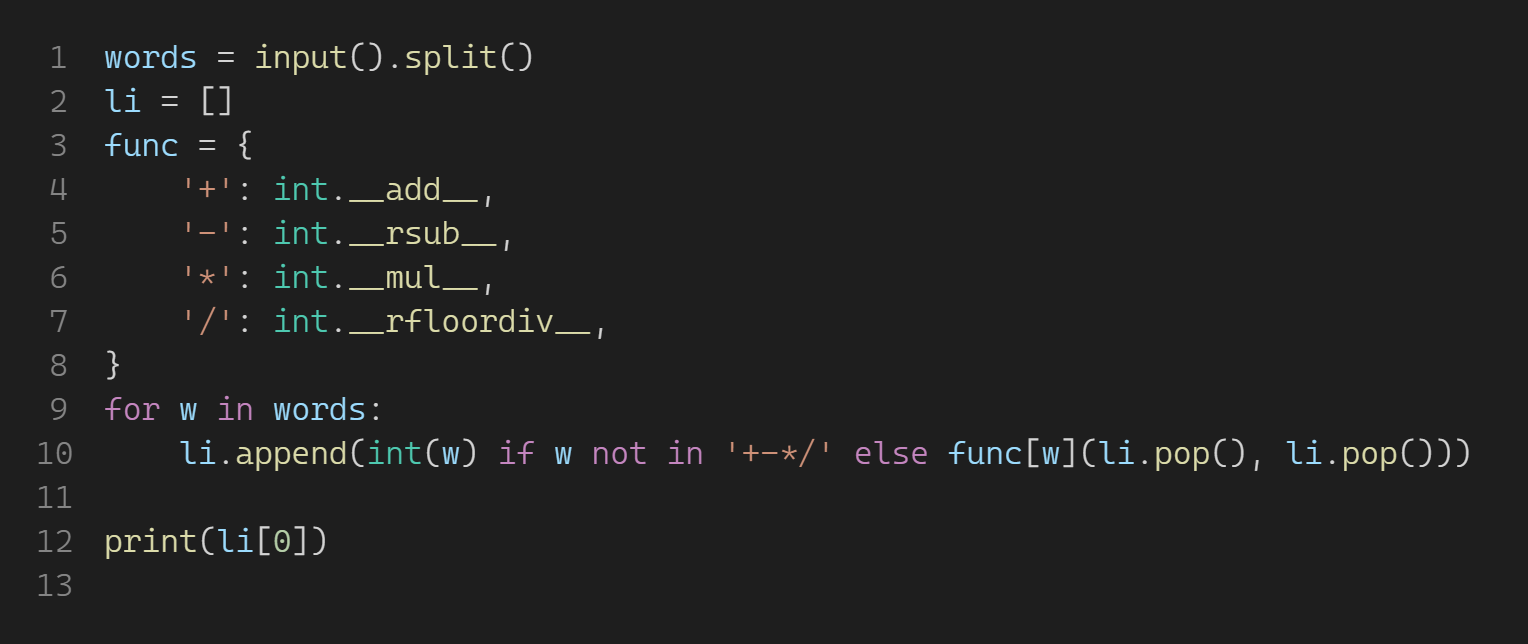 看到數字先放著不管,看到+-*/再把最後兩個數字找出來,算出東西,再丟回去當作最後一個
