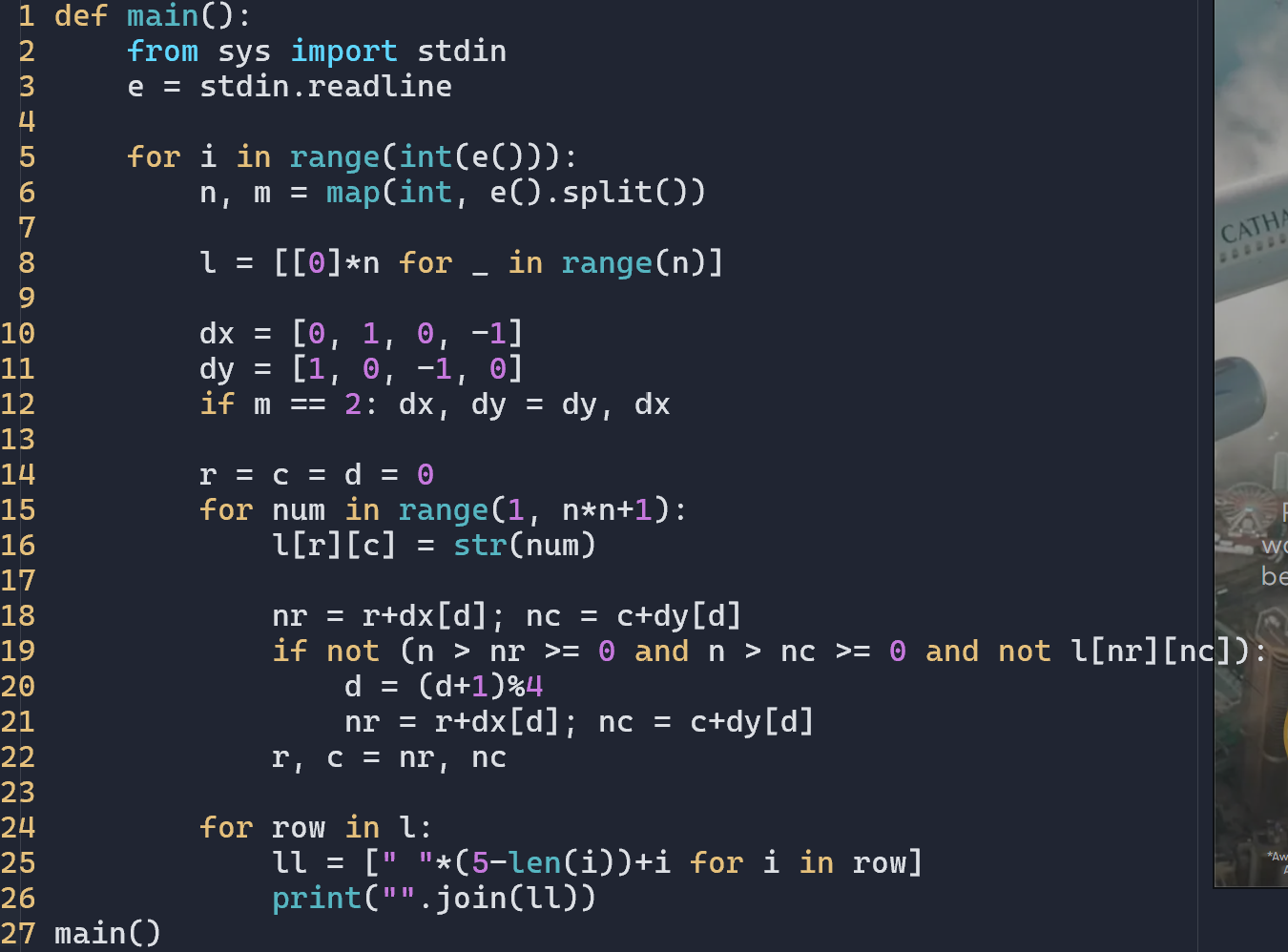 def main(): from sys import stdin e = stdin.readline for i in range(int(e())): n, m = map(int, e().split()) l = [[0]*n for _ in range(n)] dx = [0, 1, 0, -1] dy = [1, 0, -1, 0] if m == 2: dx, dy = dy, dx r = c = d = 0 for num in range(1, n*n+1): l[r][c] = str(num) nr = r+dx[d]; nc = c+dy[d] if not (n > nr >= 0 and n > nc >= 0 and not l[nr][nc]): d = (d+1)%4 nr = r+dx[d]; nc = c+dy[d] r, c = nr, nc for row in l: ll = [" "*(5-len(i))+i for i in row] print("".join(ll)) main()